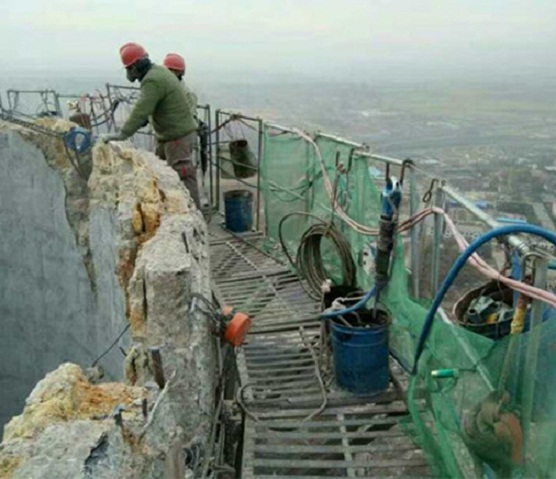 (1)煙囪正常完好,施工人員從煙囪外壁的鋼爬梯上進(jìn)行登攀到煙囪頂部(第1次攀登煙囪鋼爬梯時(shí)、首先帶好安全保險(xiǎn)帶、每個(gè)煙囪鋼爬梯都要進(jìn)行試?yán)蛽u動(dòng)、確保煙囪鋼爬梯的承受力),施工人員把保險(xiǎn)帶牢固的栓在煙囪鋼爬梯上(栓保險(xiǎn)帶時(shí)、必須要栓2-3個(gè)牢固鋼爬梯上),保險(xiǎn)帶確保牢固后,施工人員在煙囪頂部進(jìn)行人工拆除煙囪。